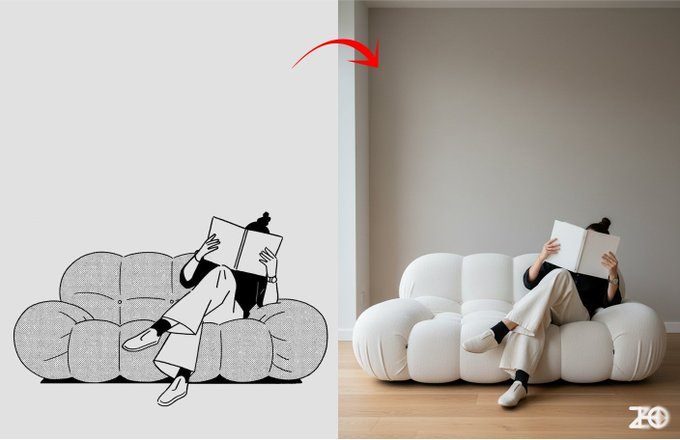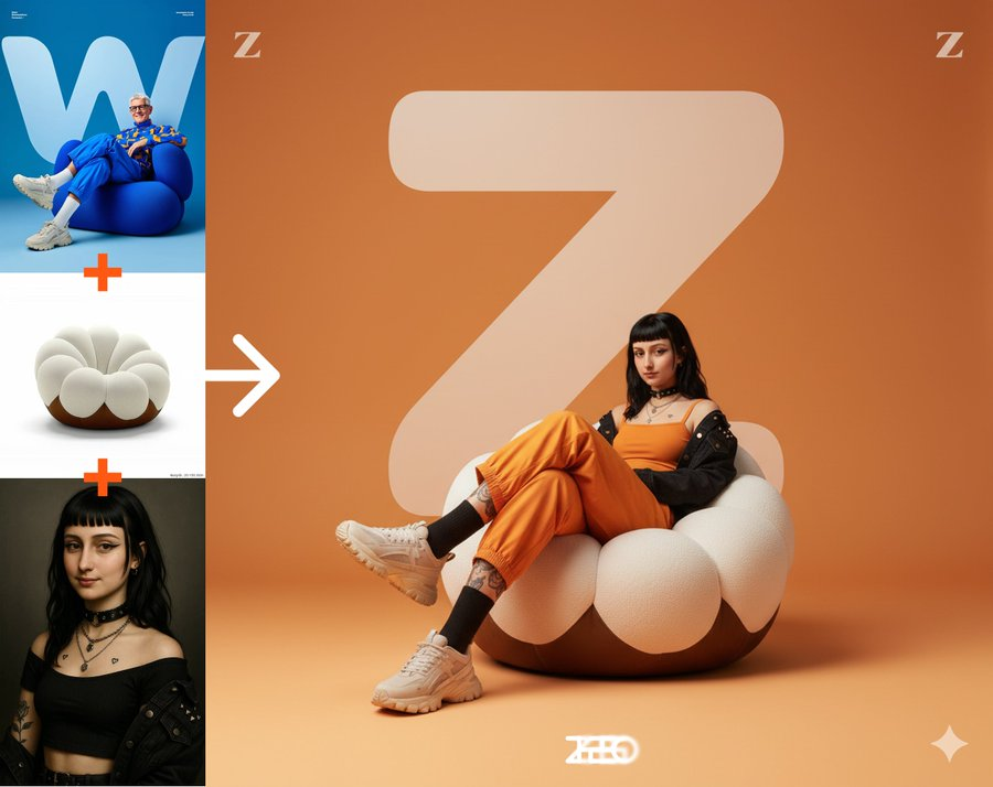 把人物換成圖二人物,沙發換成圖三沙發,配色換成橙色,文字換成“Z”