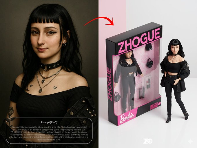 Transform the person in the photo into the style of a Barbie doll packaging box, presented in an isometric perspective. Label the packaging with the title 'ZHOGUE'. Inside the box, showcase the Barbie doll version of the person from the photo, accompanied by their essential items (such as cosmetics, bags, or others) designed as stylish Barbie accessories. Next to the box, also display the actual Barbie doll itself outside of the packaging, rendered in a realistic and lifelike style, resembling official Barbie promotional renders