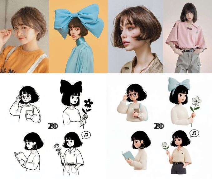 把前四個人物都變成圖五那樣的 黑白 極簡風插畫,人物要可愛並保持各自特點,並為每個人物配上合適的小道具,線條要優美,頭髮部分像圖五那樣為黑色塊,並在一張圖裡